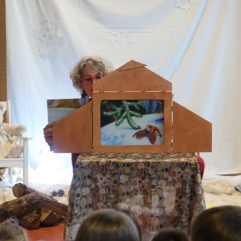 Rose aux sports D'hiver avec l'histoire de la moufle , du petit oiseau qui s'était cassé l'aile et de Gaspard et Balthazar.
